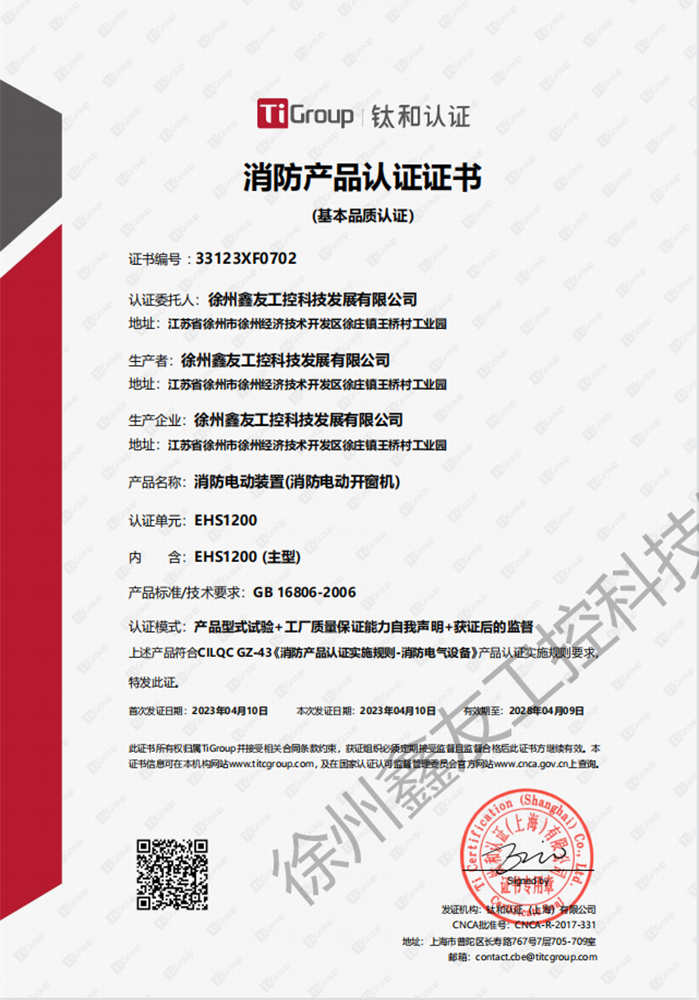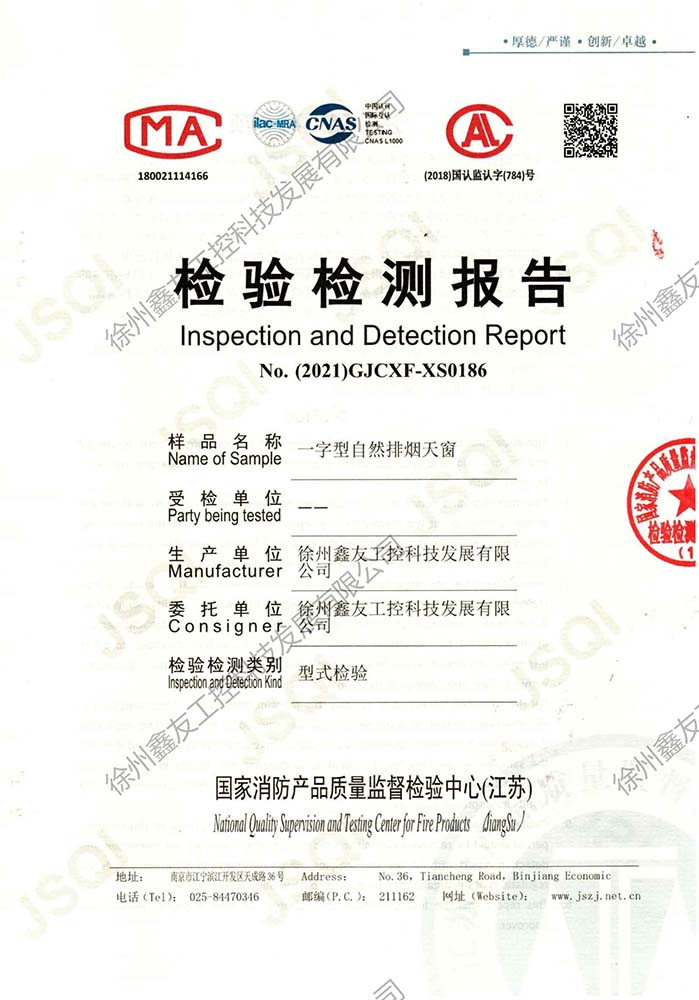 徐州鑫友工控科技發(fā)展有限公司成立于2008年,占地31600平方米,全資子公司:江蘇良紫工程科技有限公司,旗下 有“鑫友”及“MASTER.W主人窗控”兩個品牌系列,公司全面貫徹執(zhí)行IS09001:2015質(zhì)量管理體系標準,產(chǎn)品順利通過歐盟CE認證和中國***消防電子產(chǎn)品認證,通過可燃性粉塵環(huán)境下、爆炸性環(huán)境下防爆合格產(chǎn)品檢驗。排煙天窗整窗通過***消防產(chǎn)品質(zhì)量監(jiān)督檢驗中心檢測。先后獲得多項******及榮譽證書。集研發(fā)、加工、生產(chǎn)、制造、銷售、安裝及售后于一體,是一家高起點、研發(fā)能力強的專業(yè)智能化***技術(shù)企業(yè)。